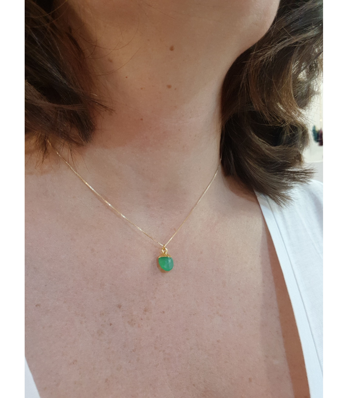 Une jolie pierre précieuse montée en amulette sur une chaine fine en plaqué or.