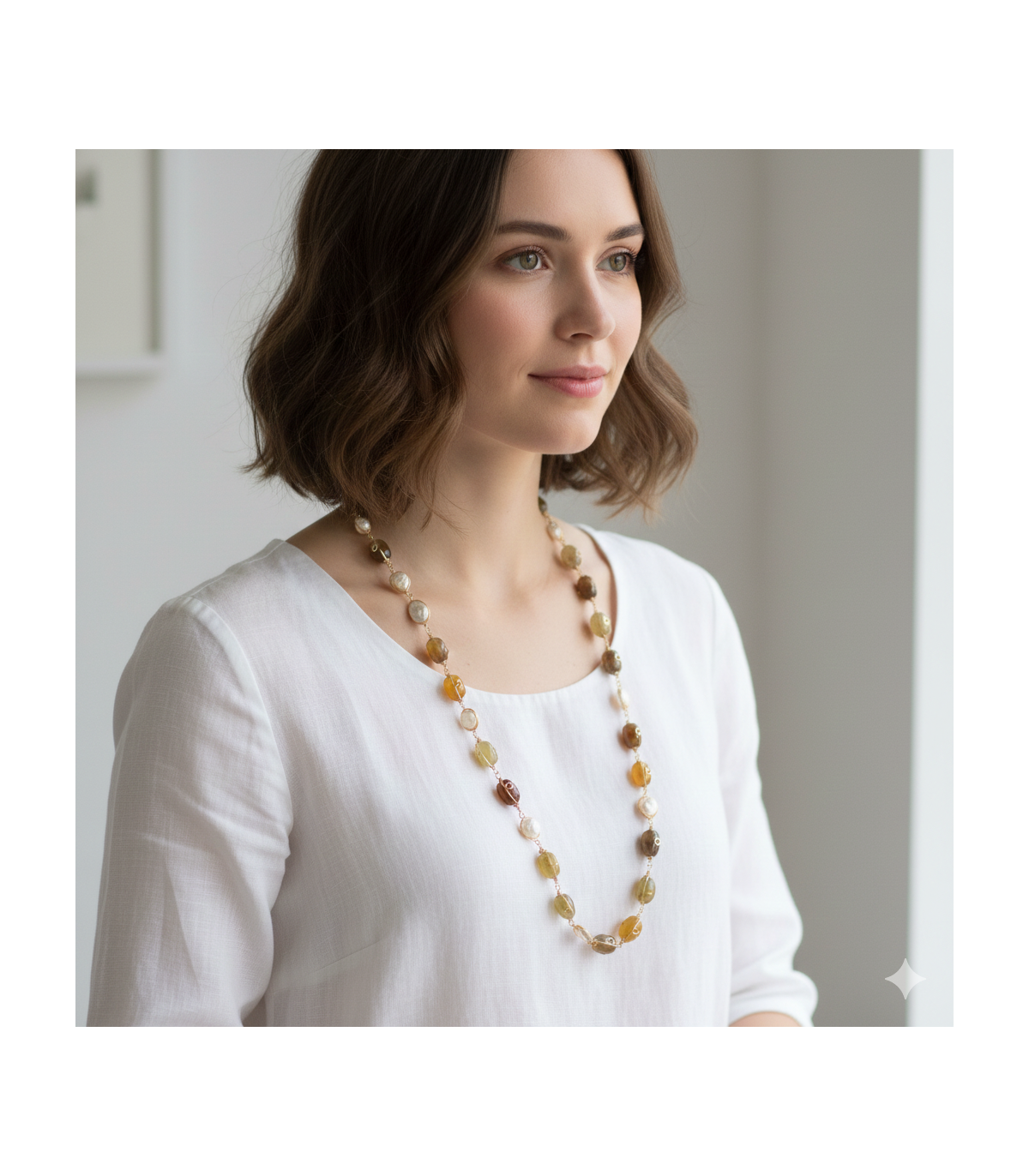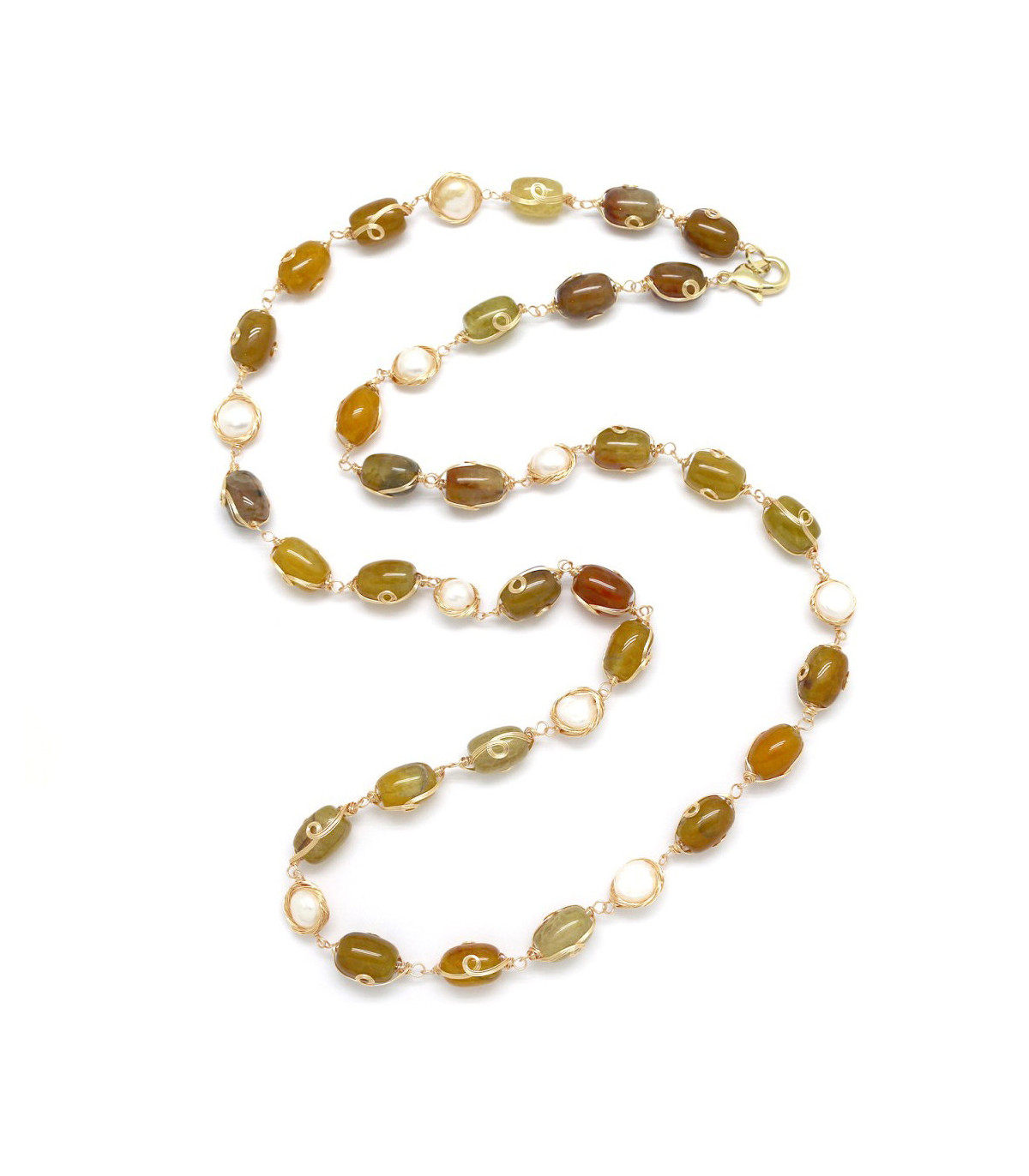 A splendid necklace made of agate stone in shades of green and light brown and freshwater pearls.