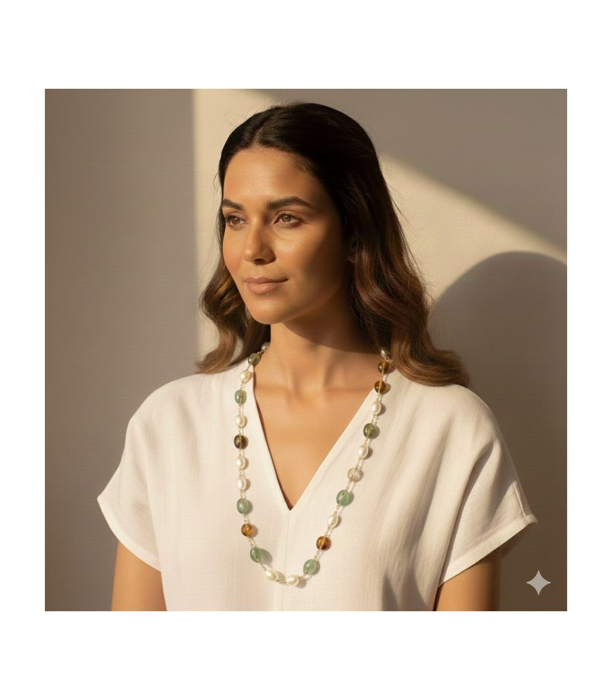 A splendid necklace made of agate stones in shades of lagoon green (amazonite), deep brown (amber), and freshwater pearls.