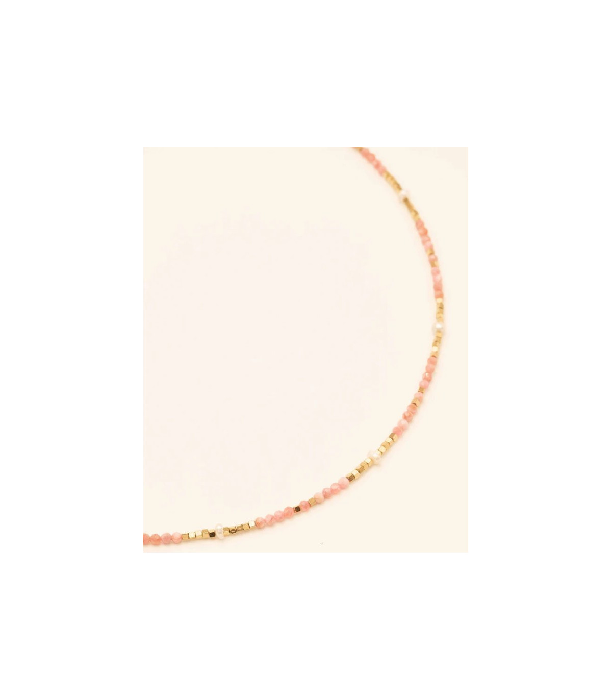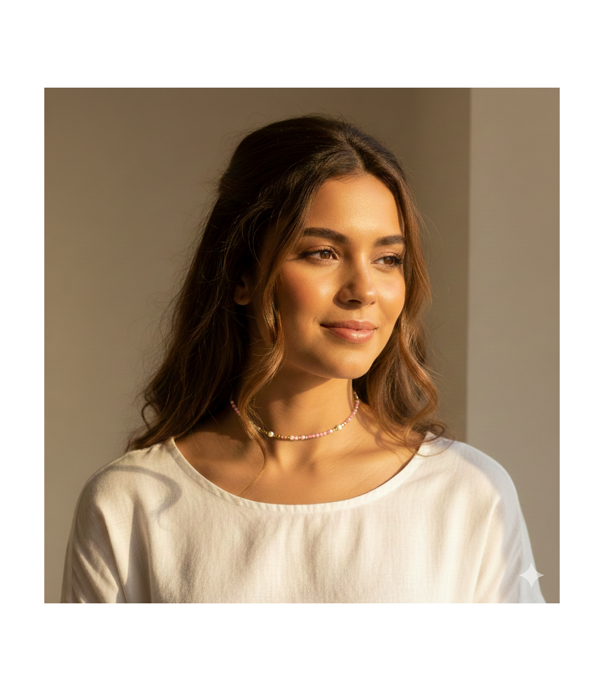 An elegant, unique, and delicately colored piece of jewelry, ideal for softening an outfit and adding a touch of sweetness to the neckline.