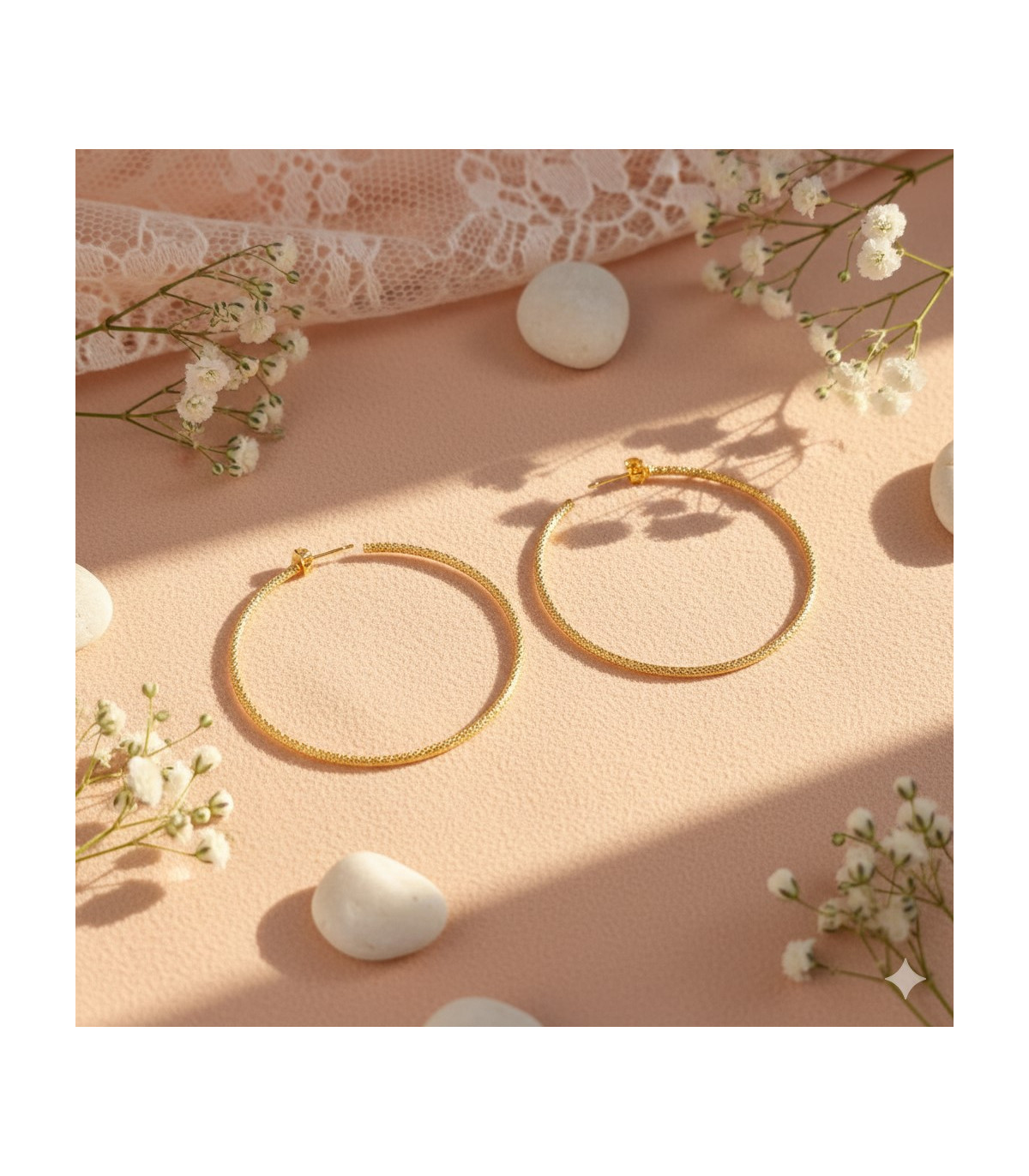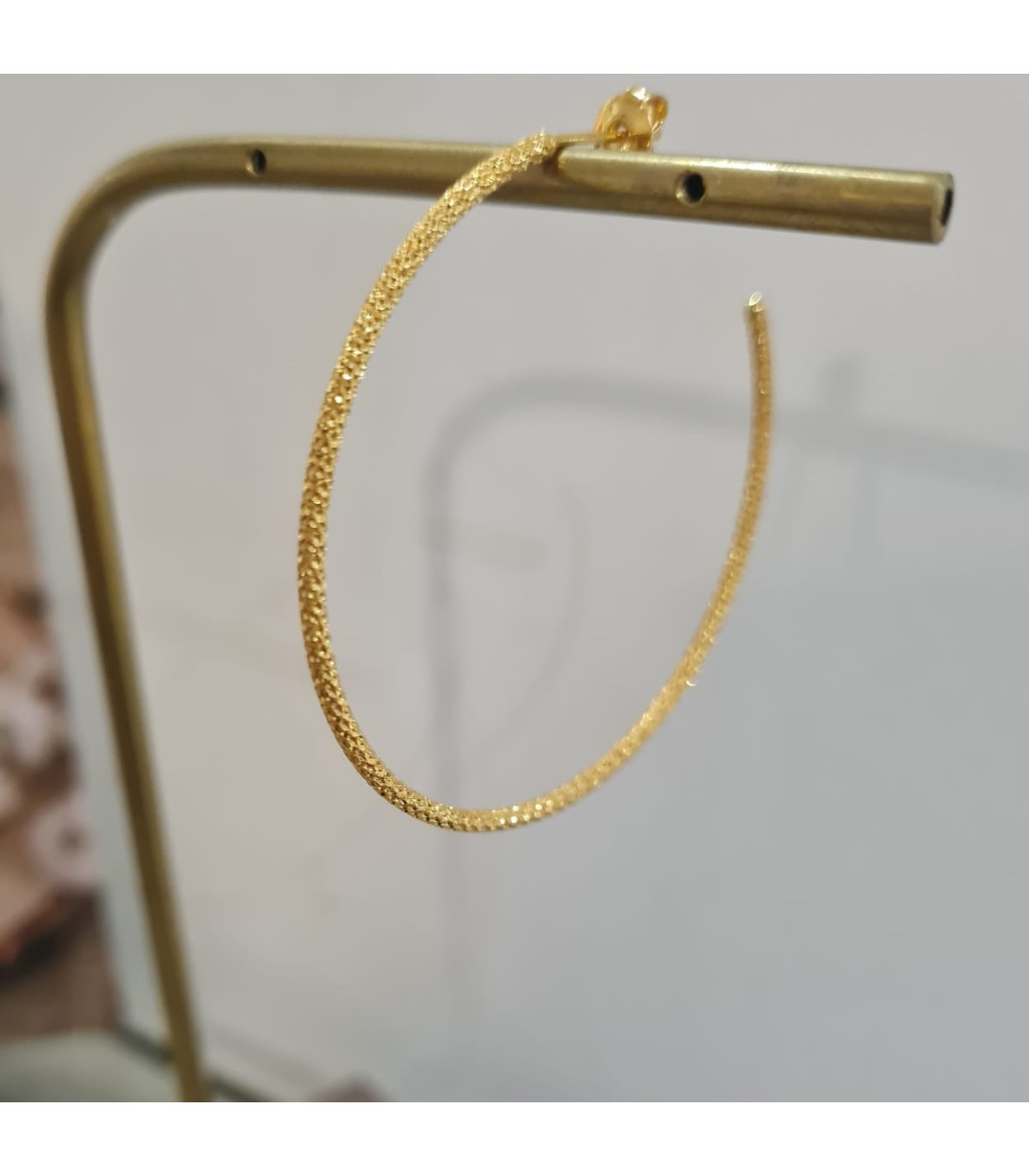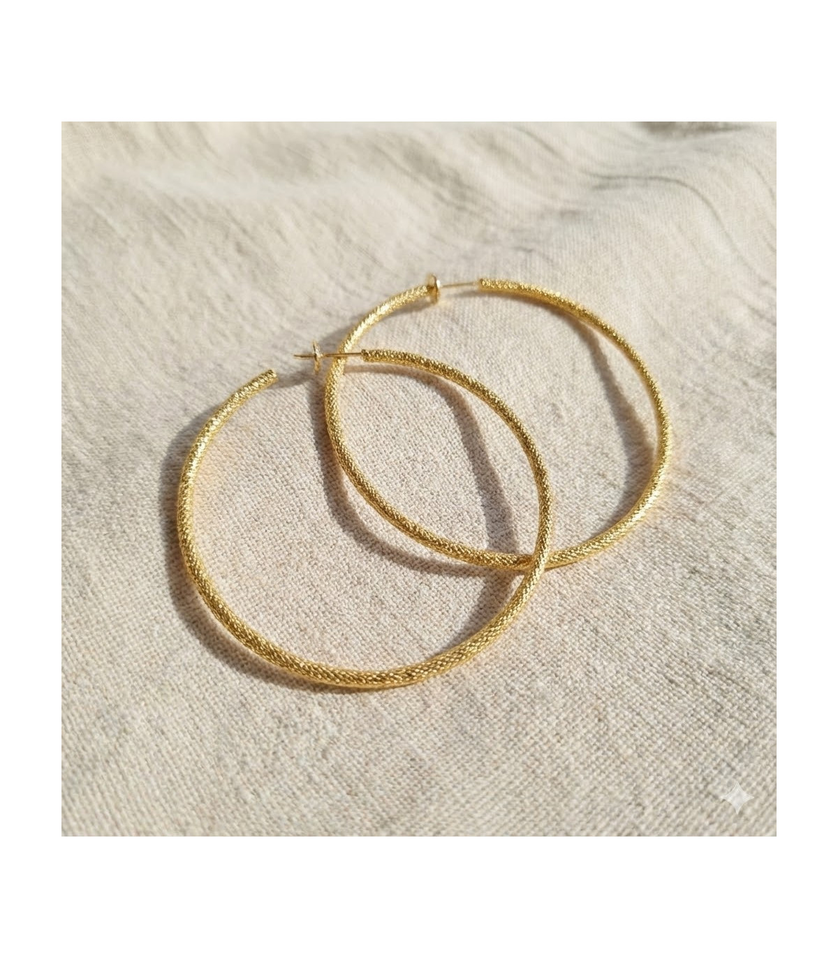 A pretty textured hoop earring 2 mm thick. These earrings are sold in pairs and are made of gold plate.