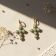 Une superbe croix composée de pierre en amazonite serties clos et montées sur créole. Le serti est délicatement ciselé ce qui donne à ces boucles un aspect baroque.