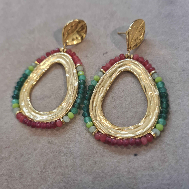 Boucles d'oreille en acier inoxydable composées d'une pampille en forme de goutte réhaussée de petites pierres roses et vertes.