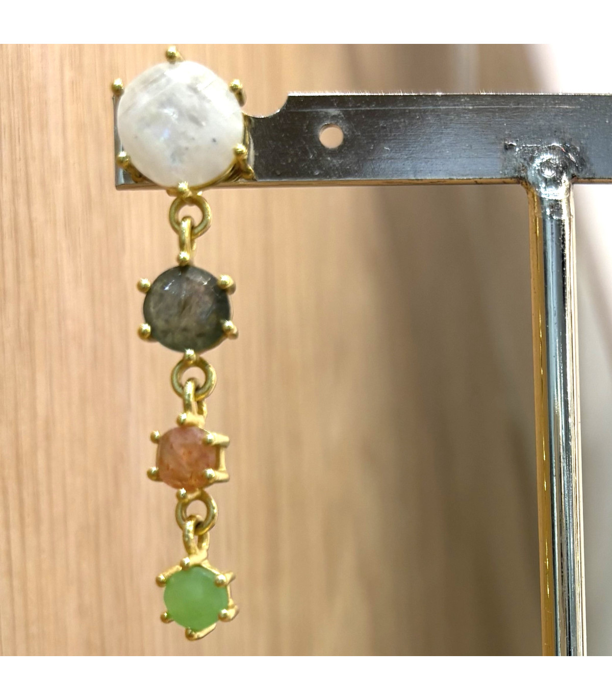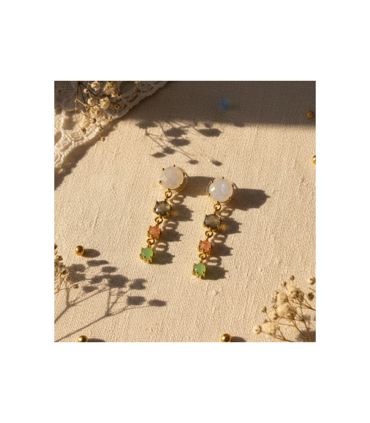 Ces délicates boucles d’oreilles Gypsie Bianca mettent en lumière quatre pierres naturelles aux énergies complémentaires. Chaque pierre , révélées dans un serti doré finement travaillé. Leur silhouette élancée crée un joli mouvement à chaque geste, tout en apportant une touche de douceur et d’éclat au visage.