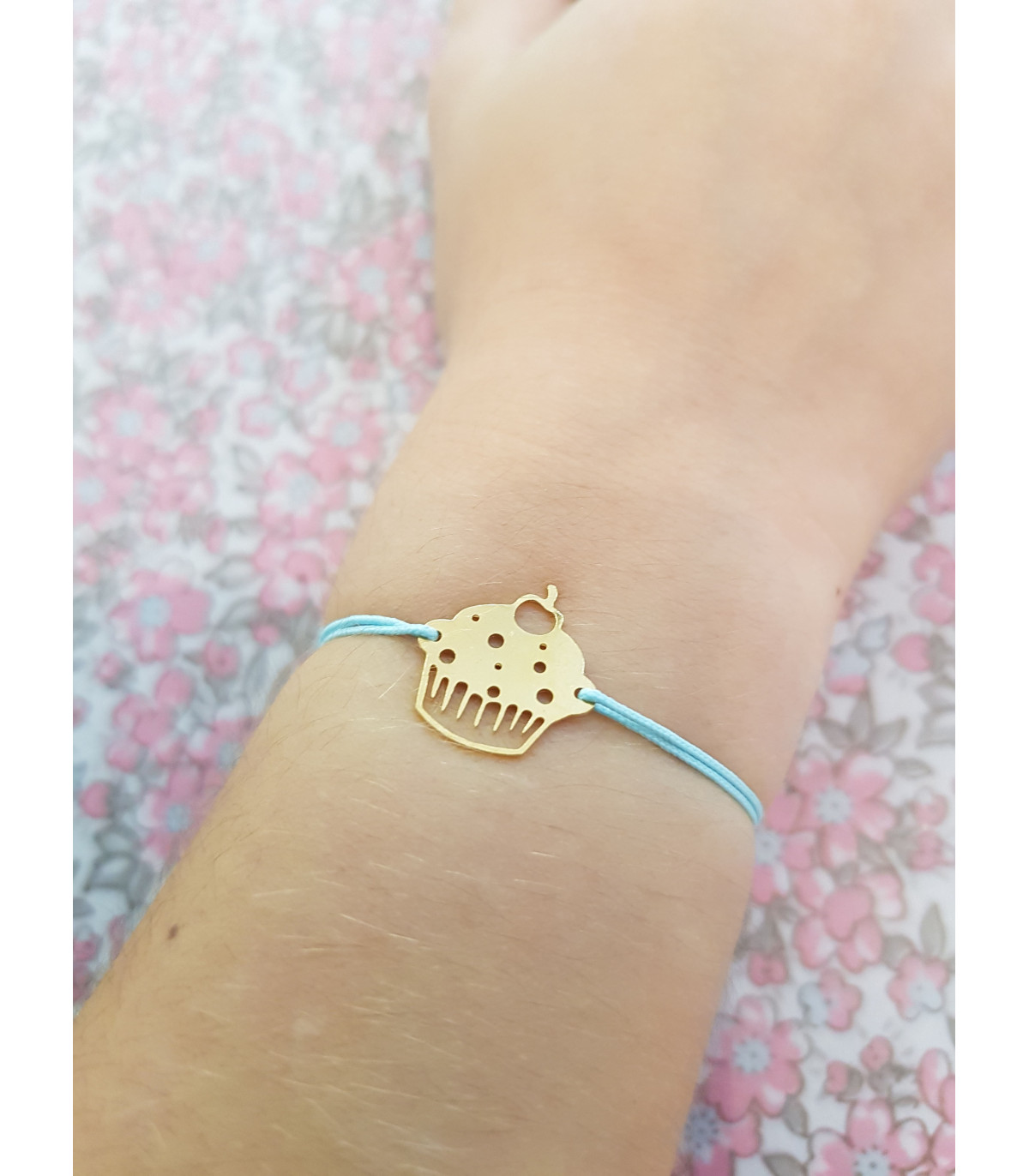 Un cupcake en plaqué Or ou Argent monté sur un cordon réglable ajustable à toutes les tailles de poignet.