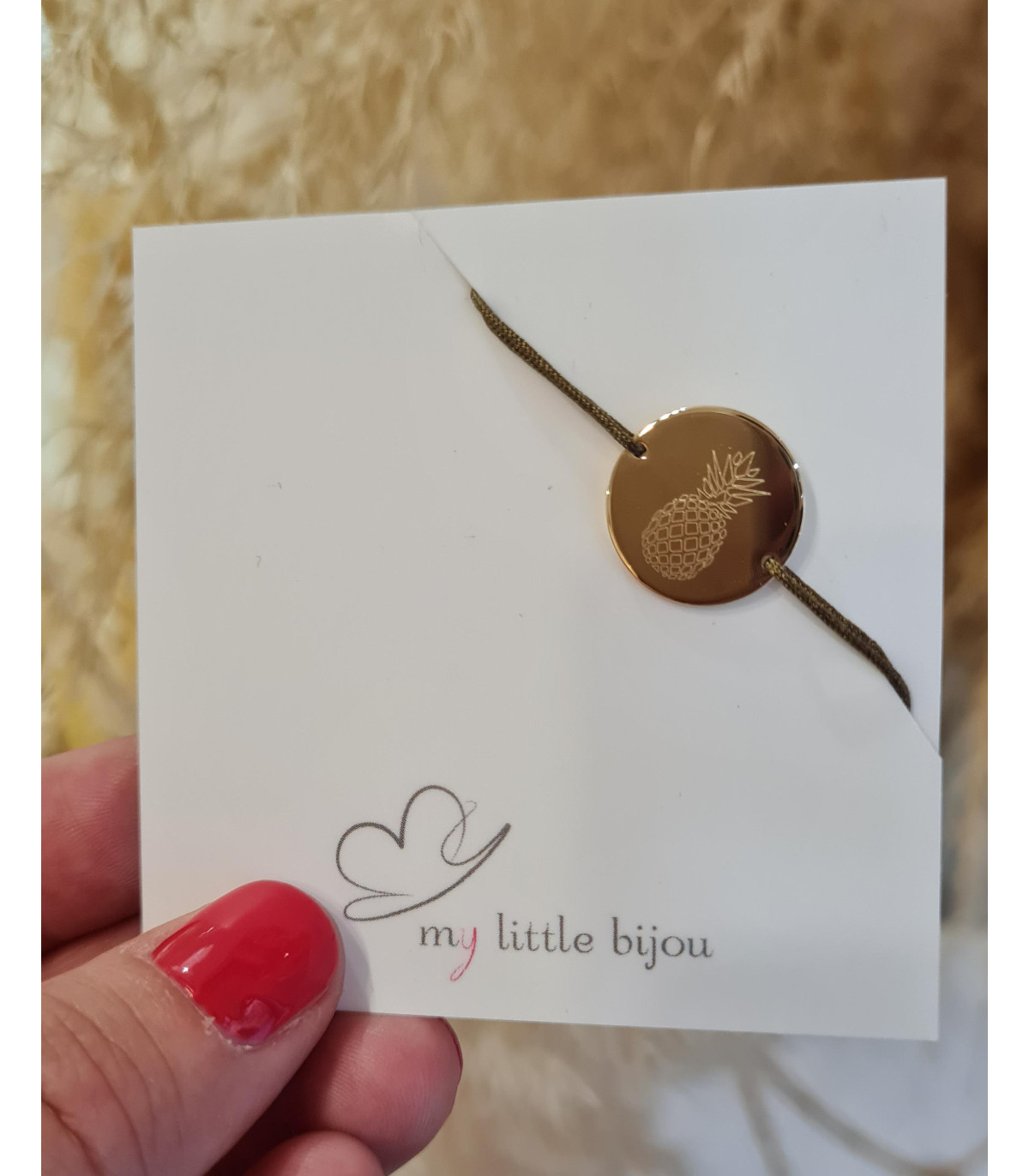 Un ananas gravé sur une médaille ronde. Vous choisissez la matière de la médaille plaqué or ou argent, ainsi que la couleur du cordon.