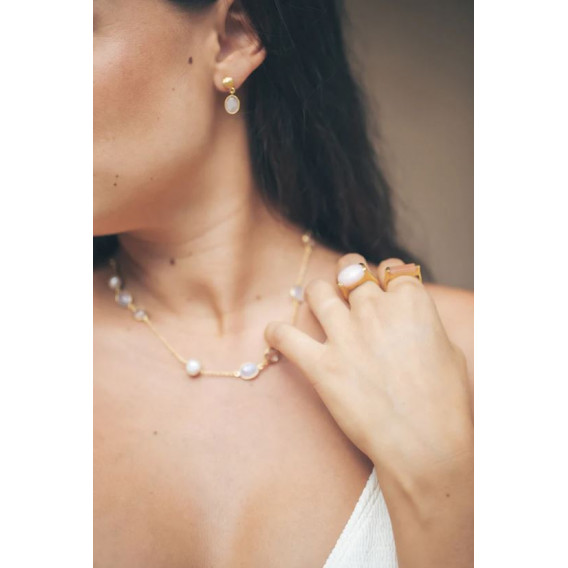 Un splendide collier en plaqué or, rehaussé de perles fines, de pierres de lune et de quartz clair sertis. Idéal pour habiller une tenue de fête.