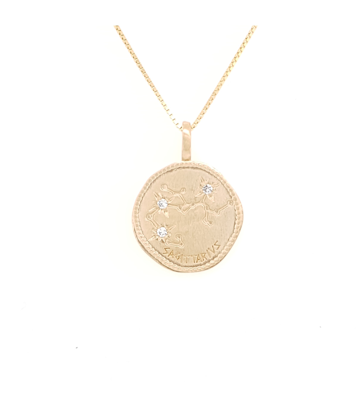 La constellation du Sagittaire, gravée sur une médaille en plaqué or mat et rehaussée de petits zirconiums.