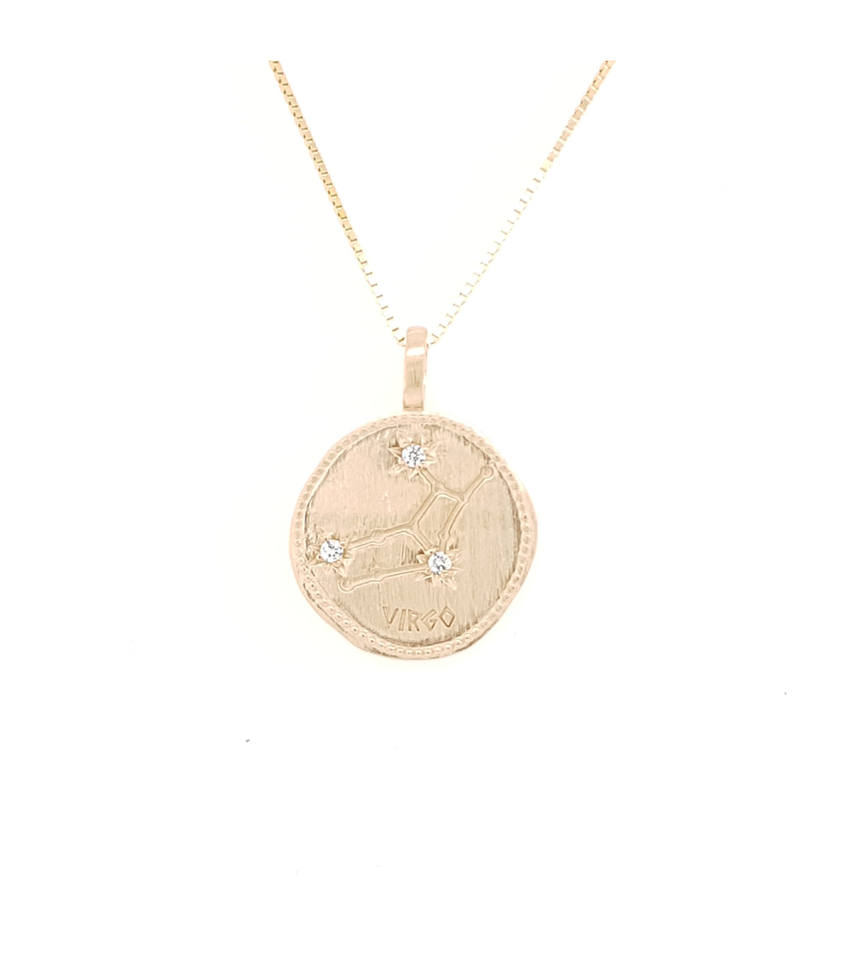 La constellation de la Vierge, gravée sur une médaille en plaqué or mat et rehaussée de petits zirconiums.