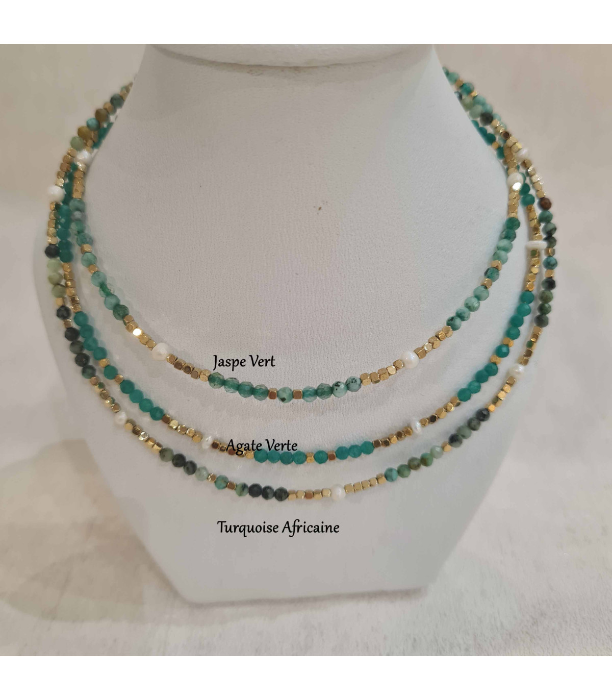 Collier en pierres en Agate Verte rehaussées de quelques perles de culture et perles carrées en acier inoxydable.