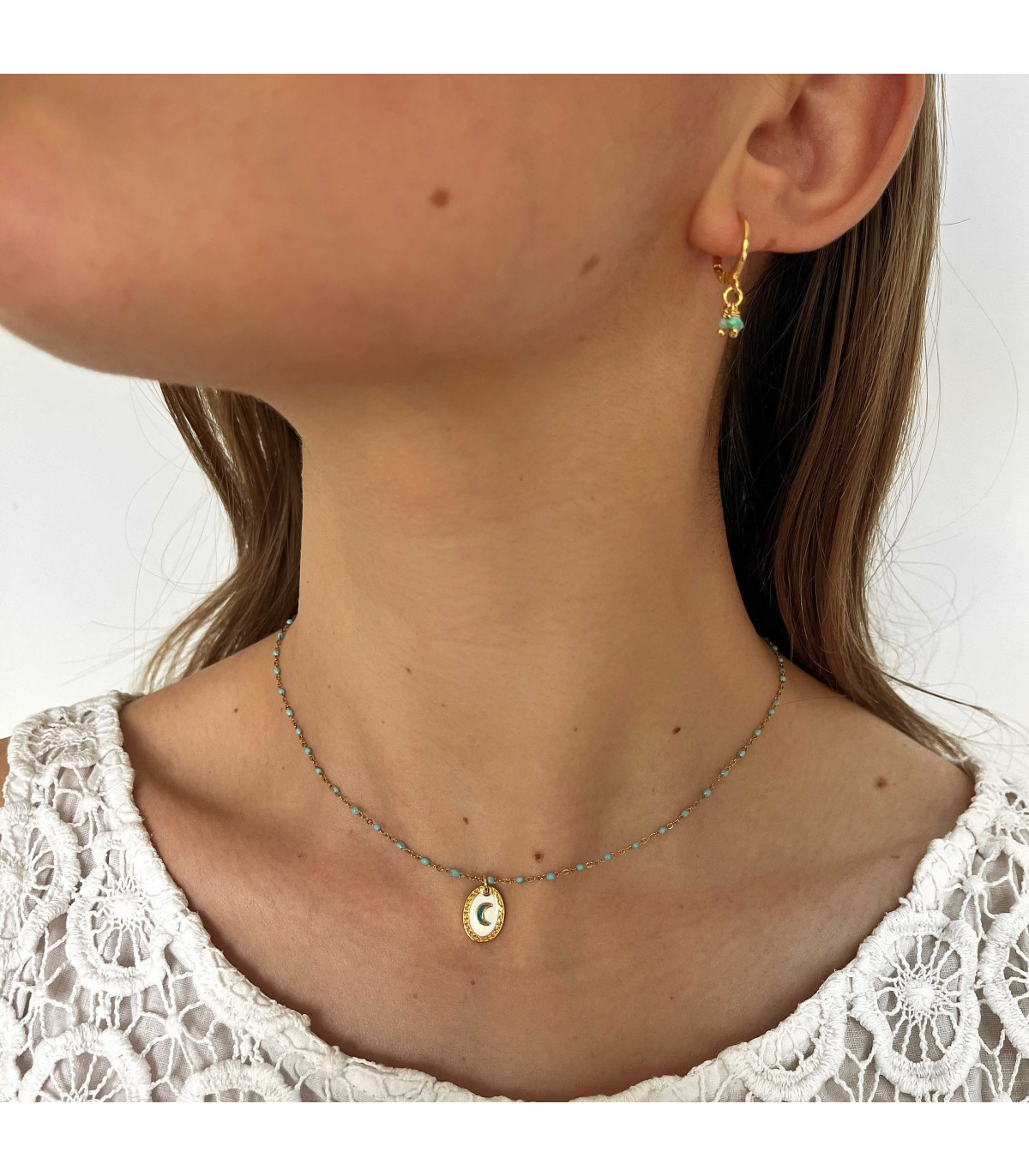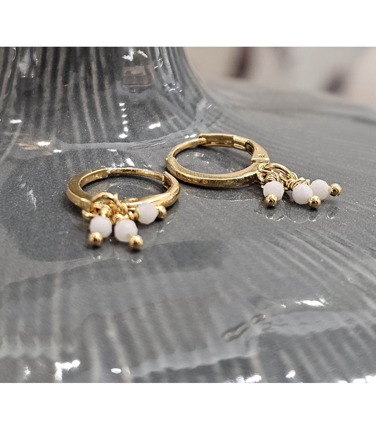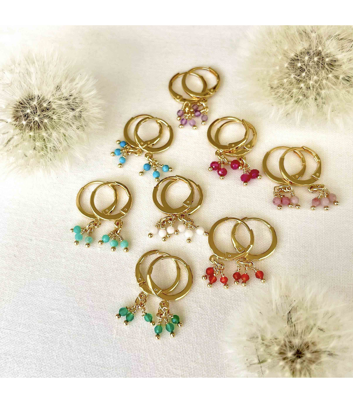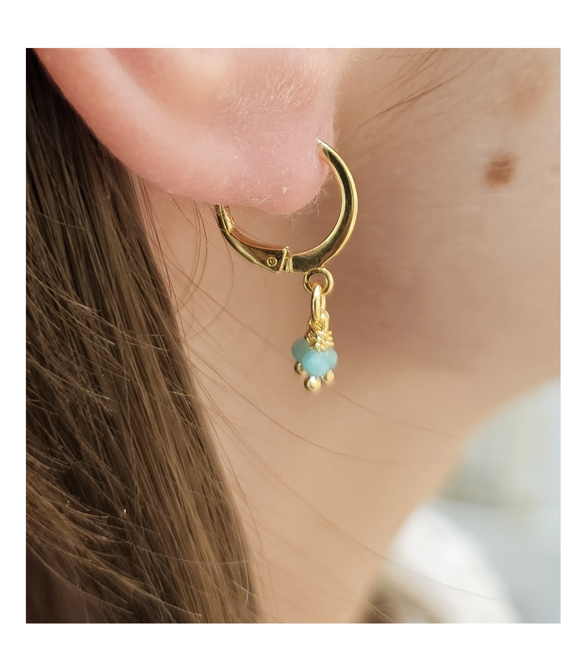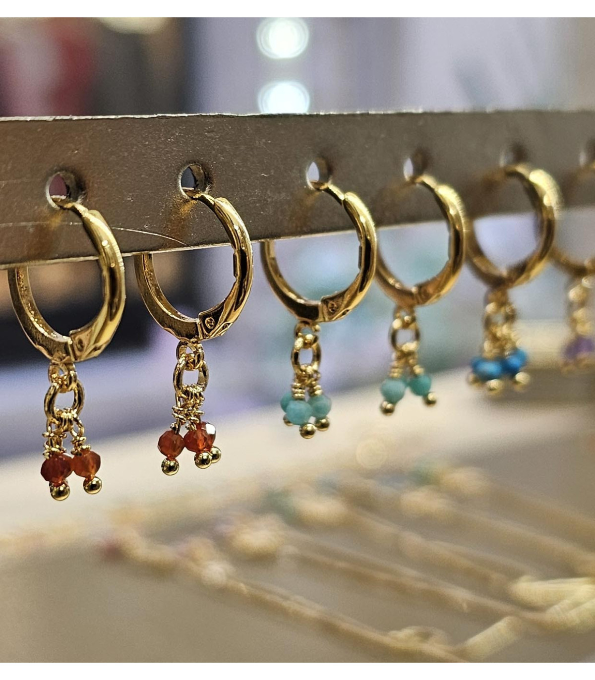 Créoles dorées à l'or fin, rehaussée de trois petites pierres naturelles. Donnez une touche de couleur discrète à vos tenues.