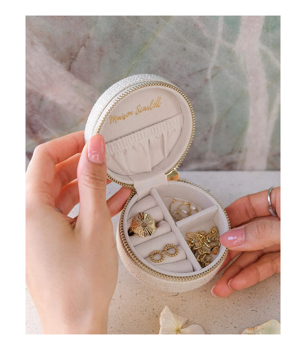 YVONNE, la boîte à bijoux de voyage de Maisoj Scarlett est idéale et deviendra sans nul doute l’alliée de toutes vos aventures ! C'est un petit format très fonctionnel pour vos activités quotidiennes. En lin crème ou Rose pale, elle est mignonne, compacte et se glisse aussi bien dans un sac à main que dans une valise.